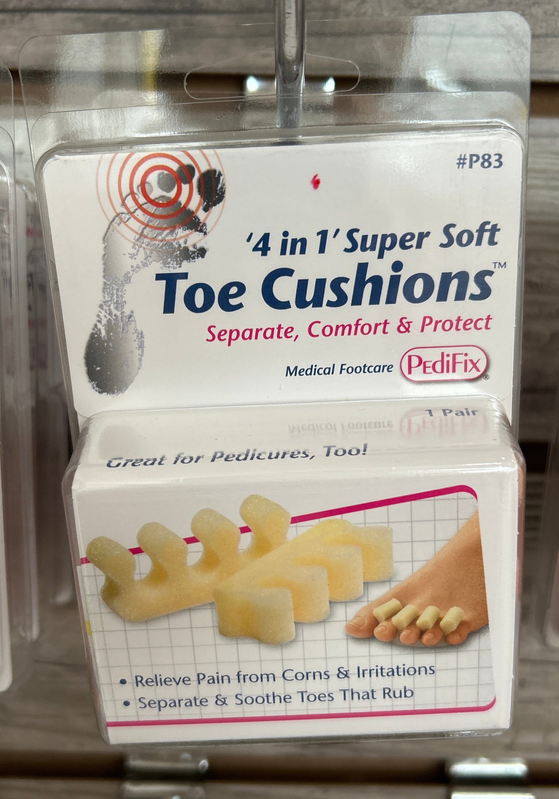 PediFix "4 in 1" Super Soft Toe Cushions divide toes to absorb pressure and friction while comforting corns and other toe irritations. Help protect toe tops & tips, support bent-under ‘hammer’ toes and more. Wear on top or under, between 2, 3 or all toes. PediFix "4 in 1" Super Soft Toe Cushions are great for pedicures, too. Scissor-trimmable for a custom fit.