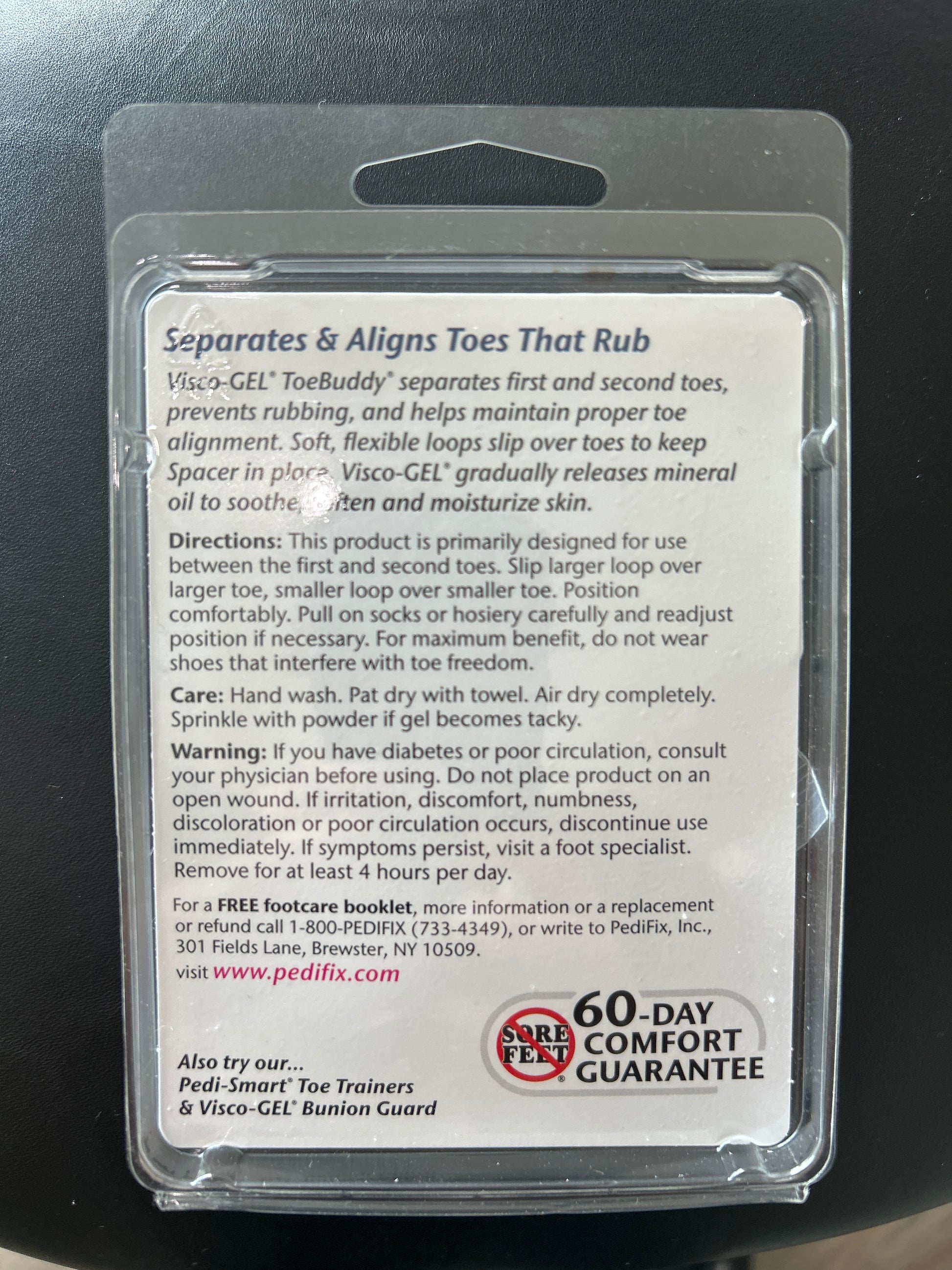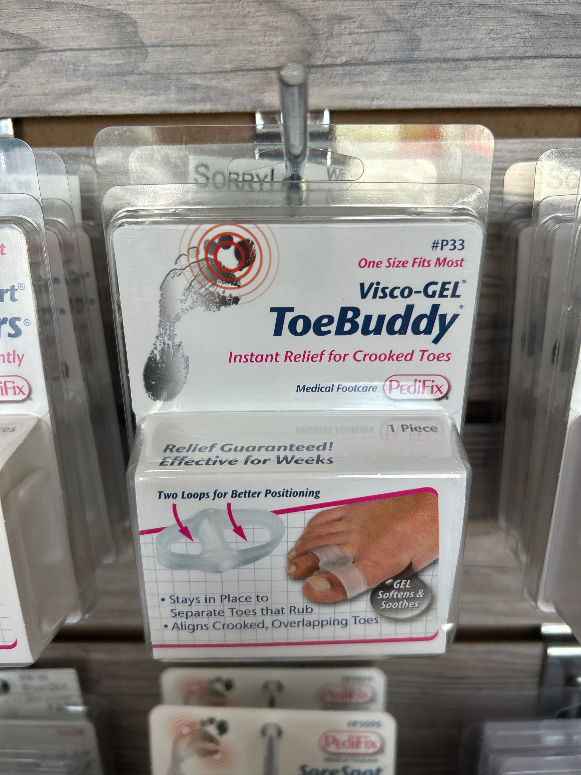 Two loops keep a soft Gel spacer in perfect position between first and second toes to separate and align. PediFix Visco-GEL ToeBuddy Bunion Guard absorbs pressure and friction to relieve bunion pain. Exclusive Visco-GEL® soothes and softens skin. Thin design fits in most footwear styles and makes shoe more comfortable. Washable, reusable and effective for months. PediFix Visco-GEL ToeBuddy Bunion Guard is Interchangeable for right or left foot.